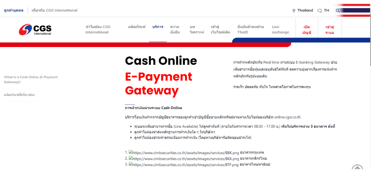 ช่องทางการฝากถอนของโบรกเกอร์ CGS-CIMB ซีจีเอส-ซีไอเอ็มบี สำหรับช่องทางการฝากเงิน Cash Online (E-Payment Gateway) ผ่านธนาคารกรุงเทพ, ธนาคารไทยพาณิชย์ และธนาคารกสิกรไทย ช่องทางการถอนเงินแจ้งความประสงค์ในการถอนเงินหลักประกันได้จากหน้าเวปไซต์